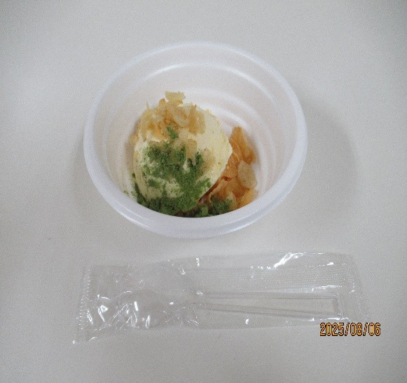 アイスクリームは、器の底にコンフレークを入れて、その上にアイスをのせ、アイスの上にトッピングとして砕いたポテトチップをのせます。最後に、抹茶orチョコレートソースをかけて豪華なアイスクリームの完成です。例年の納涼祭はかき氷が定番でしたが、今年は趣向を変えてみました。アイスクリームを食べた皆さんからは、「おいしかった」という感想が多く聞かれました。