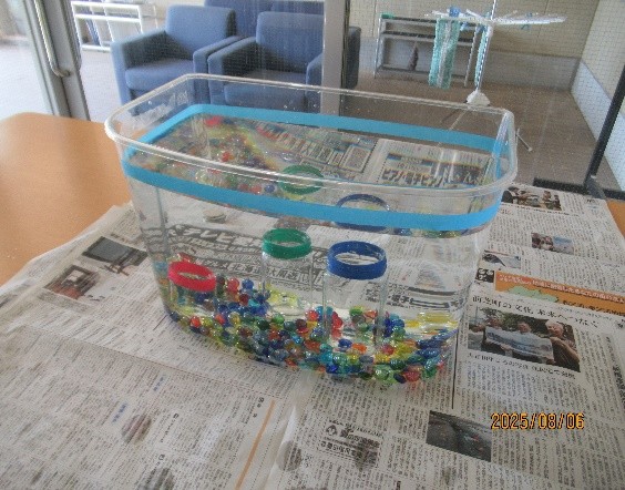 水中コイン落としは、水の入った水槽にコインを落とし、大きさの違う3つの瓶にコインを入れるゲームです。瓶の大きさで点数を決め、小さい瓶にコインが入れば高得点になります。得点に合わせて1~3等の景品を用意しました。小さな水の揺れ、コインを水に入れる角度で、思ったようにコインが落とせず、参加した多くの方が苦戦を強いられる高難易度のゲームとなりました。その中で、1等を手に入れた参加者の方々は、とても喜んでいました。