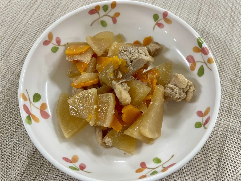 治部煮とは石川県金沢市の郷土料理で金沢市の名物の肉や野菜を煮込んだ料理です。当院では鶏肉・人参・大根・玉葱を煮込んで提供しています。良質なたんぱく質が豊富な鶏肉、抗酸化作用のあるβカロテンが含まれる人参、ビタミンCや食物繊維が摂れる大根、血液をサラサラにしてくれる作用のある硫化アリルが含まれる玉葱など栄養素が一品でたくさん摂取できるメニューです。