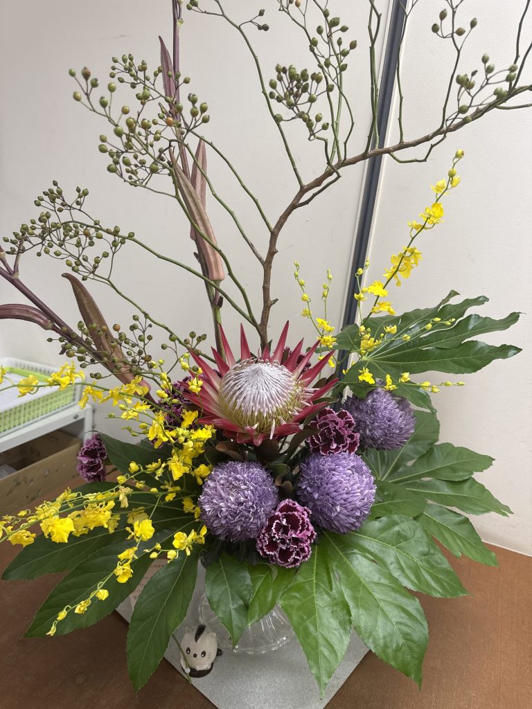 キング・プロテアの花言葉は**「王者の風格」です。その他にも「自由自在」や「華やかな期待」**といった花言葉もあります。これは、キング・プロテアの雄大な姿が王様のように見えることに由来します。