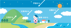 自然放射線は、空から宇宙線、地面や岩から出る放射線、さらには食物や私たちの体の中からも少しの放射線が出ているとお話ししました。